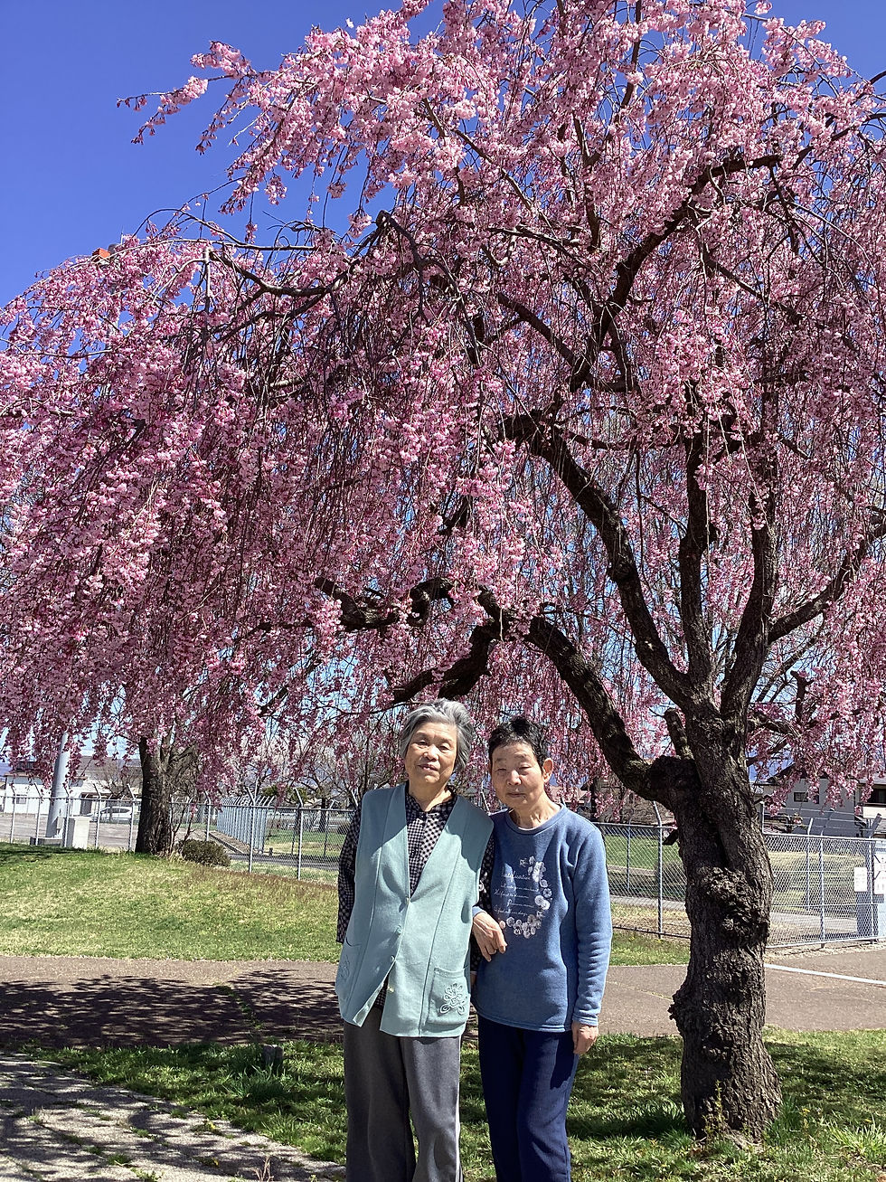 さくらを見ながら「きれいだな」「うめ~もん食べてな」